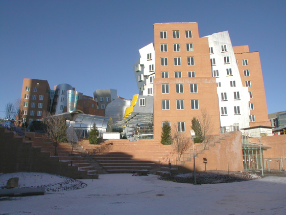 We then set off to find my old friend Ben, who’s now a graduate student here and also works in the Stata Center. Since the building is rather complicated (I mean, just look at it!), I look him up on the directory computers and we head off in search of his listed office. We find the floor and proceed to walk down the hallway checking every office for his, but failing to find it. The number just isn’t listed. We walk back and check again. We check the number on a computer terminal and find we got it wrong, it’s on the other side, so we check that hallway. Still no luck. The number doesn’t seem to exist. We ask some people; they have no idea. Finally one confirms there’s no such number here. They suggest we try the same number in the opposite tower, so we do, and he’s there. (Lying directory!)